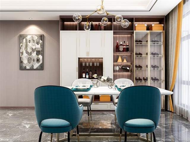 如果擔心到頂柜太過壓抑,可以適當加入通透的玻璃柜門,柜內(nèi)藏酒還有裝飾作用,作為餐廳的亮麗風(fēng)景線。